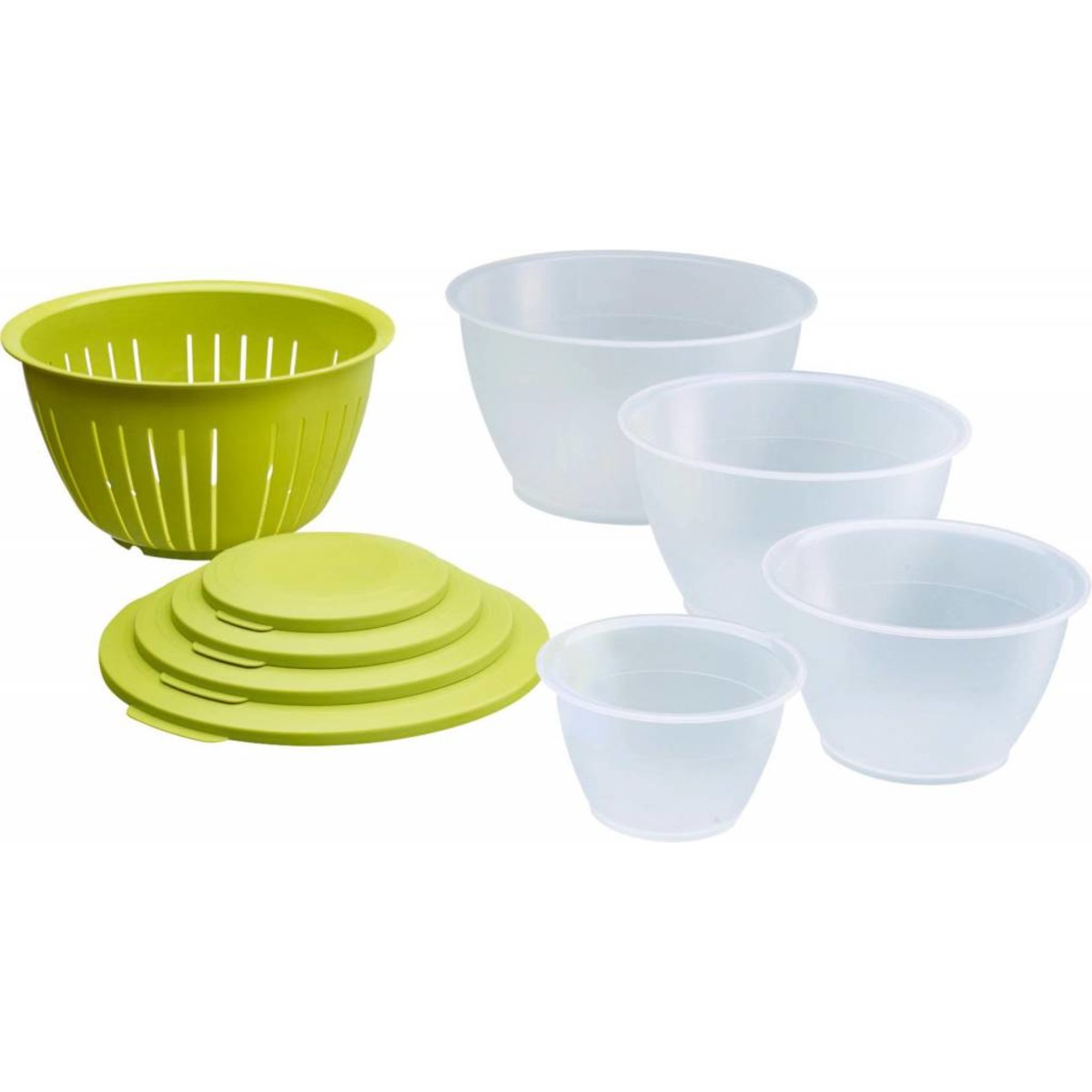 Material: PP = Polypropylen, BPA FREE, bestehend aus: je 1 Schüssel 0,6L - 1,3L - 2,5 L - 4,3L mit jeweils dichtschließendem, passendem Deckel + 1 Seiher, spülmaschinengeeignet, Made in Germany.